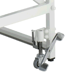 Zentrales Rollenhubsystem Die Liege kann mit einem Tritt, beidseitig der Liege bedienbar, auf die Rollen (D - 50 mm) gestellt und verfahren werden. (Kann auch nachträglich an die Liege geschraubt werden !) |