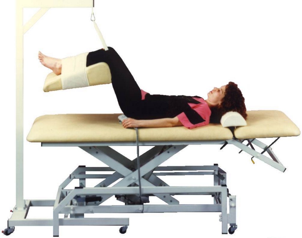 Durch den fast lotgerechten Hub der ExKombi Liege STAUFENBERG lässt sich das nicht höhenverstellbare Stativ von der Fußseite der Liege platzieren. Die Beine des Patienten lassen sich bequem auf dem Schaukelpolster, mittels des breiten Gurtes, fixieren. Die Liege kann dann elektromotorisch nach unten gefahren werden, bis die gewünschte Lagerungsposition für den Patienten erreicht wurde.