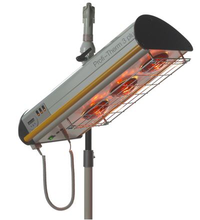 Zusätzlich ist der "PROFI-THERM 3 Plus" mit einer intgrierten Dimmerschaltung und einem Patientenruf ausgestattet. Die Dimmersteuerung erfolgt über einen Handschalter, welcher vom Patienten bedient werden kann, um die Itensität der Bestrahlung zu regulieren oder den Patientenruf zu aktivieren. Durch die aktivierung des Patientenrufs wird die Bestrahlung unterbrochen und ein akustisches Signal ausgegeben, nach Ausschalten des Patientenrufs kann die Bestrahlung fortgesetzt werden.