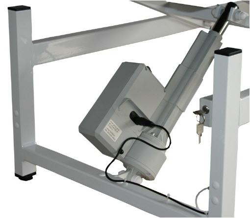 Zum Einbau muss das Hubrohr des Antriebes komplett eingefahren sein, prüfen Sie dies ! Mit dem Schraubbolzen (M10x40) befestigen Sie den Antrieb an der Querstrebe des Fußrahmen (selbstsicherne Mutter M10 verwenden !). Danach befestigen Sie das Hubrohr mit dem Scherenarm, drehen Sie das Hubrohr "heraus" bis dass die Bohrungen übereinanderpassen und Sie die Schraube (M10 x 70) passgenau einbringen können ! Diese Einstellung bewirkt, dass der Antrieb NICHT GEGEN SICH SELBST arbeitet wenn der Oberrahmen auf den Unterrahmen aufsetzt.